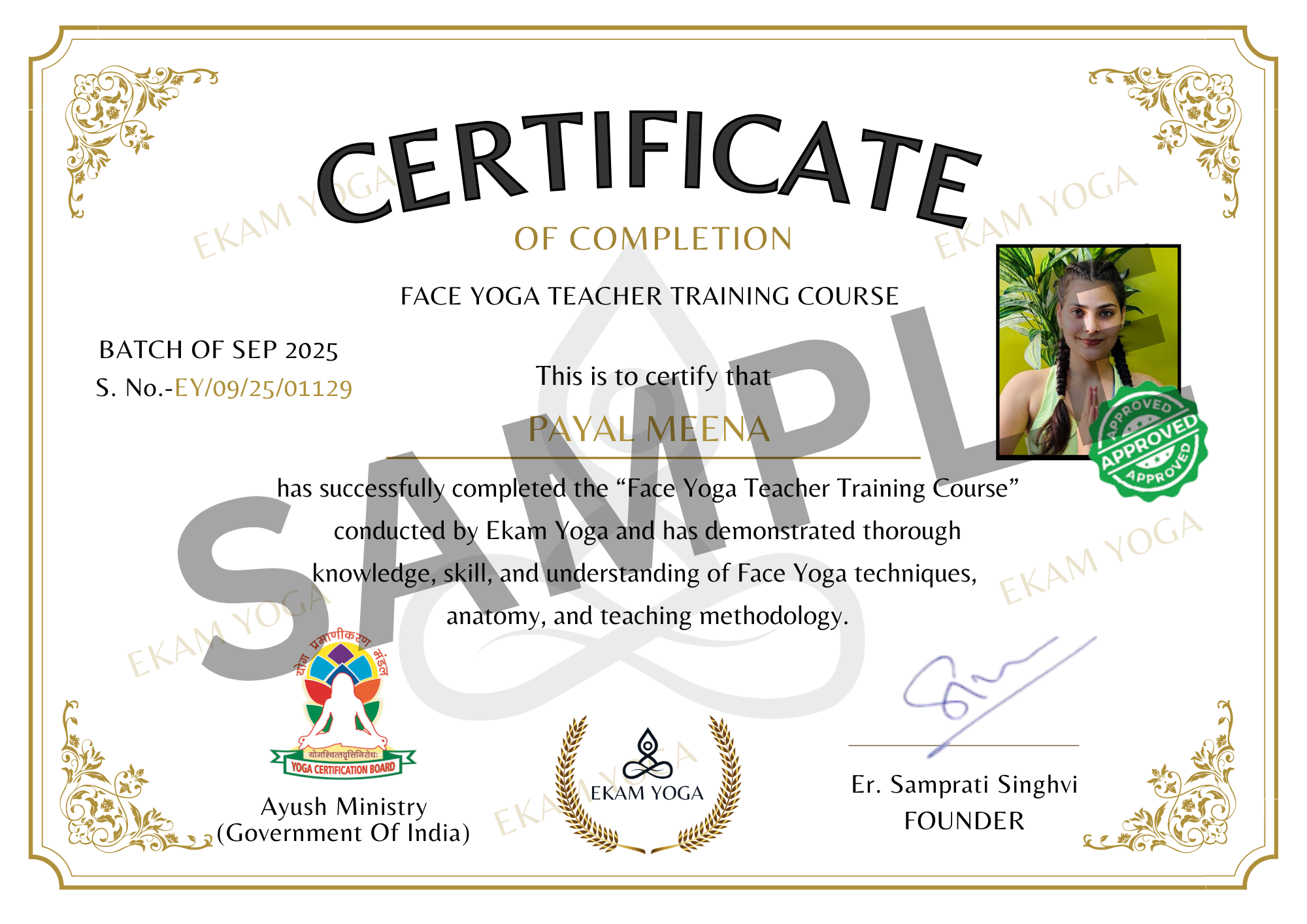 At the end of the course, there will an assignment submission which will determine your certification. The Ekam Yoga Academy's yoga course is a credible certification course and the certificate will hold a great deal of value as there are fewer instructors that teach face yoga and have a deeper understanding of the yogic philosophy.