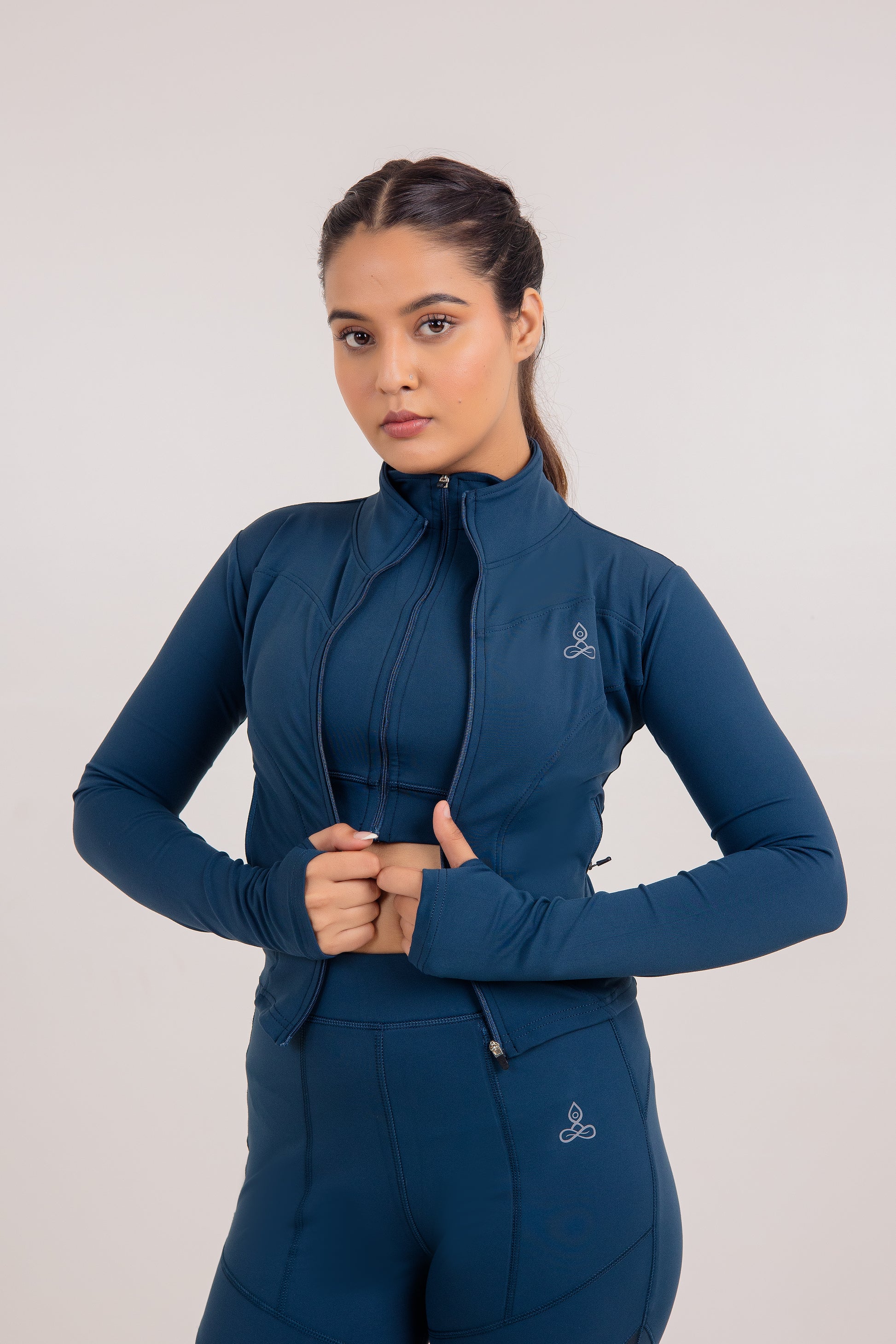 Layer the Agni Jacket over your sports bra or crop top for a sleek, athletic look. Pair it with tights, flared pants, or shorts to complete your yoga-ready outfit. Its zip-up front and soft stretch fabric make it perfect for warm-ups, cooldowns, or casual travel days.